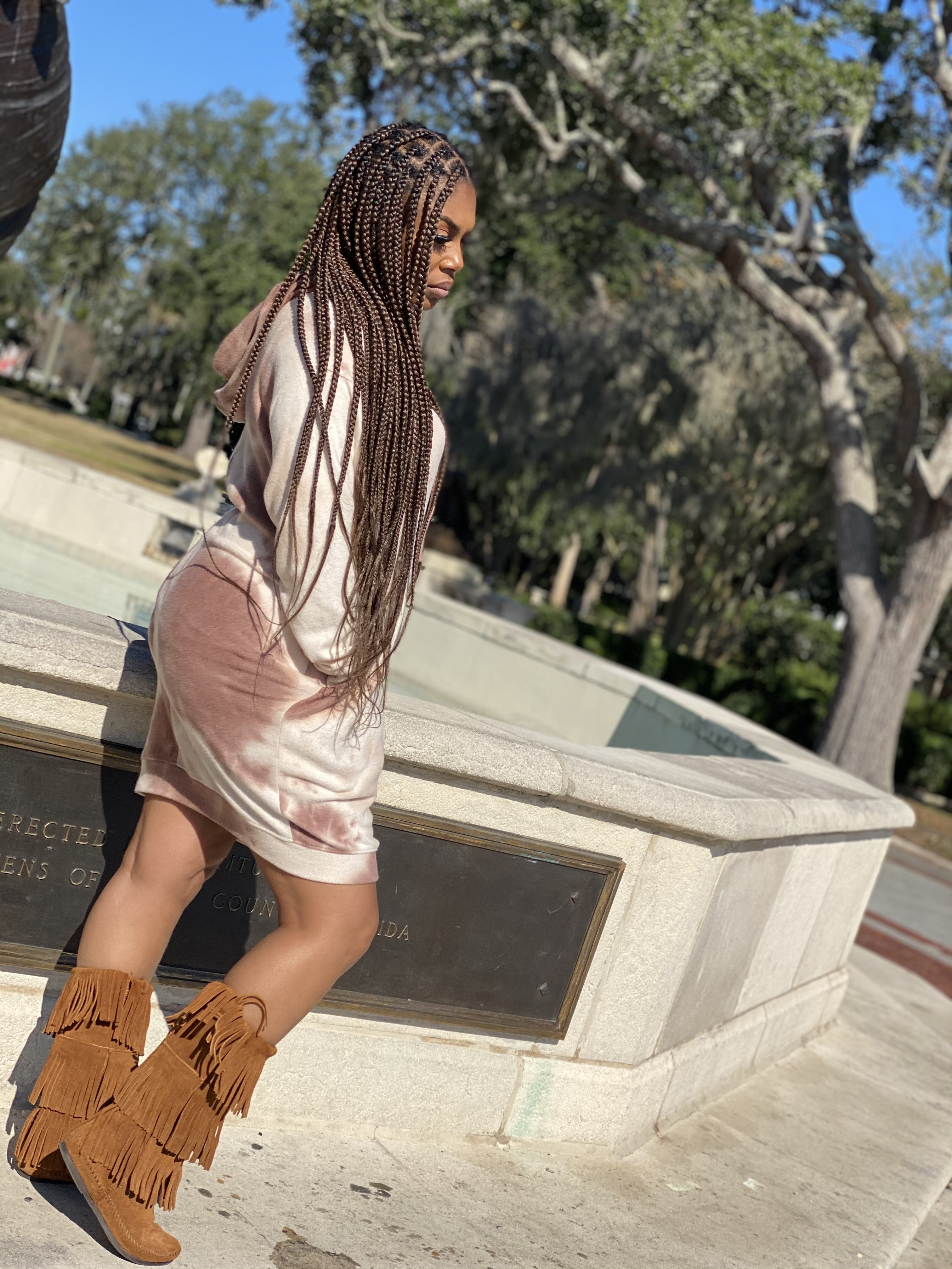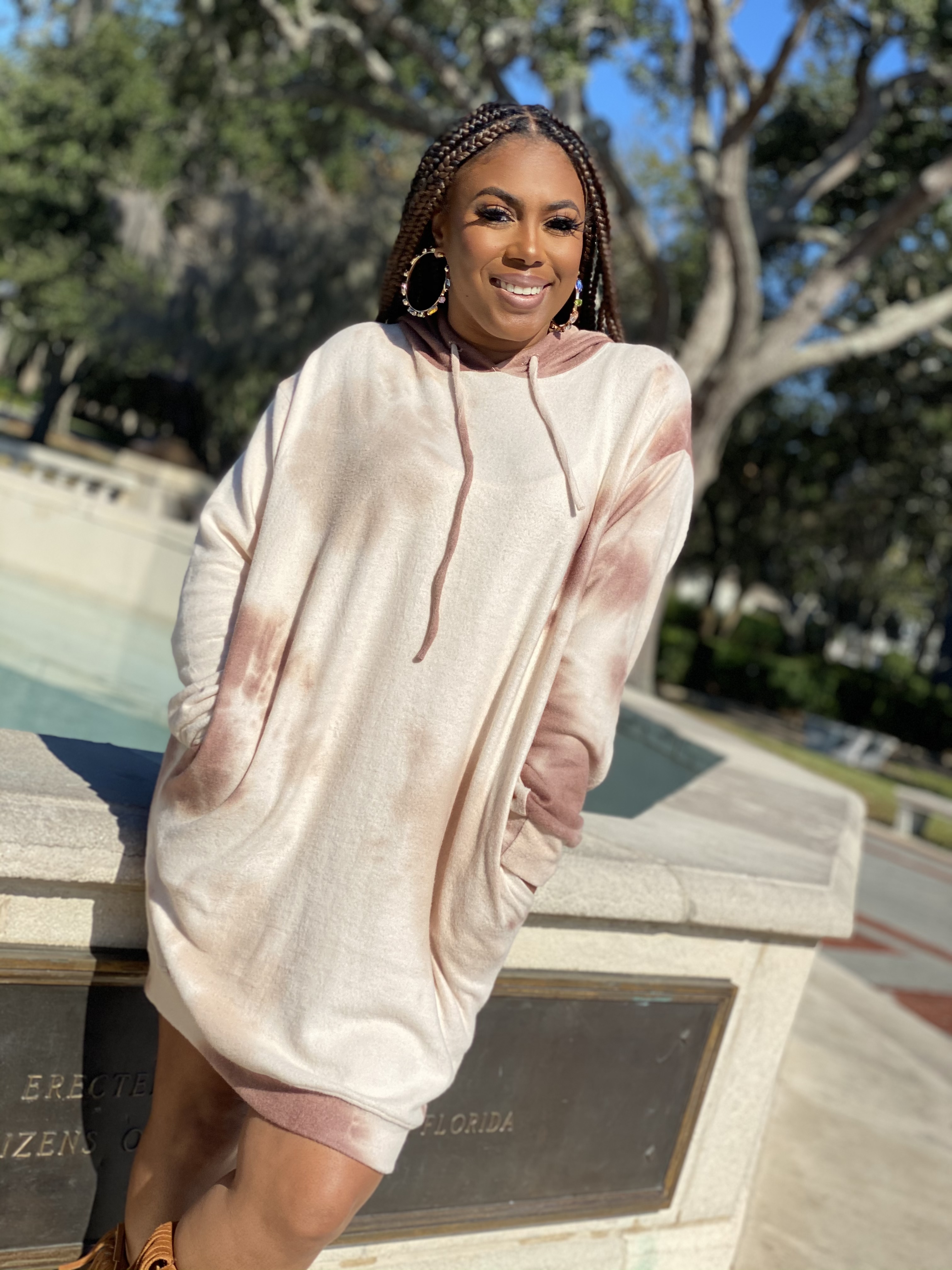 This dress Runs big, model is wearing a small. Dress is super stretchy.