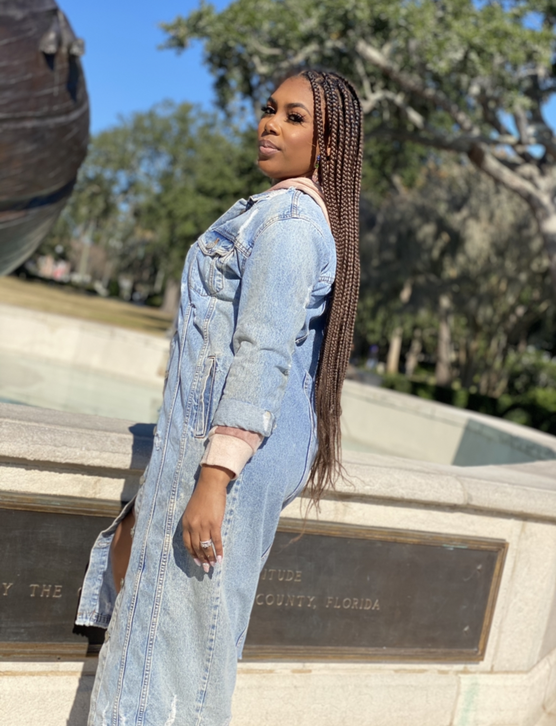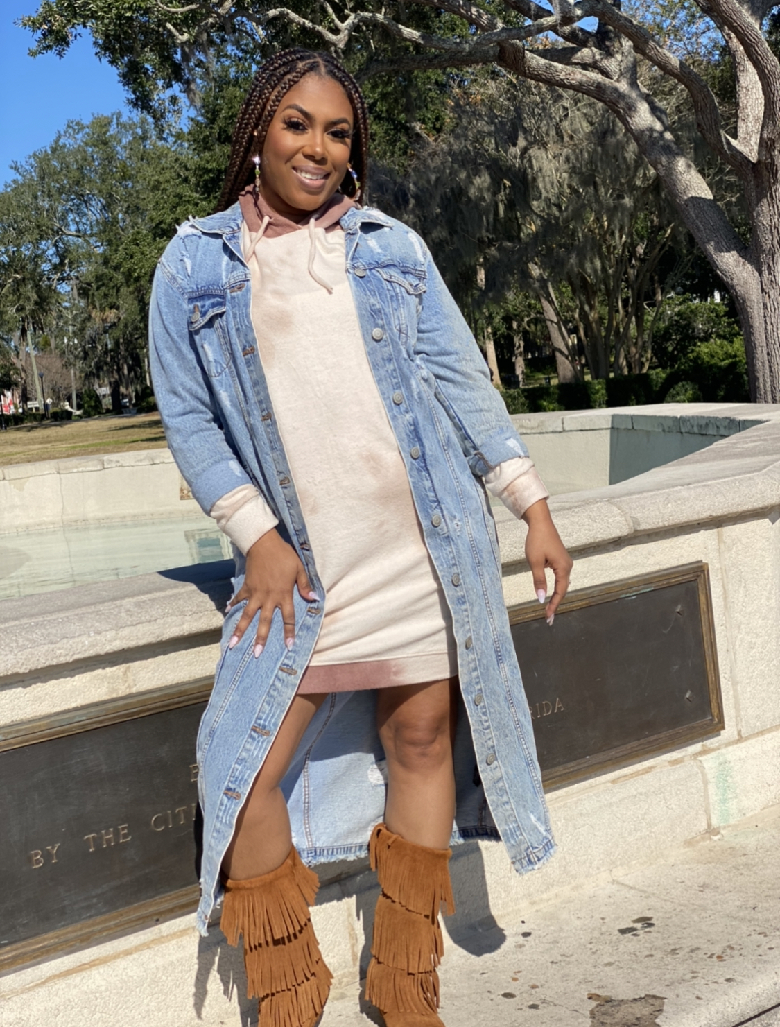 Distressed long denim jacket. Run big.